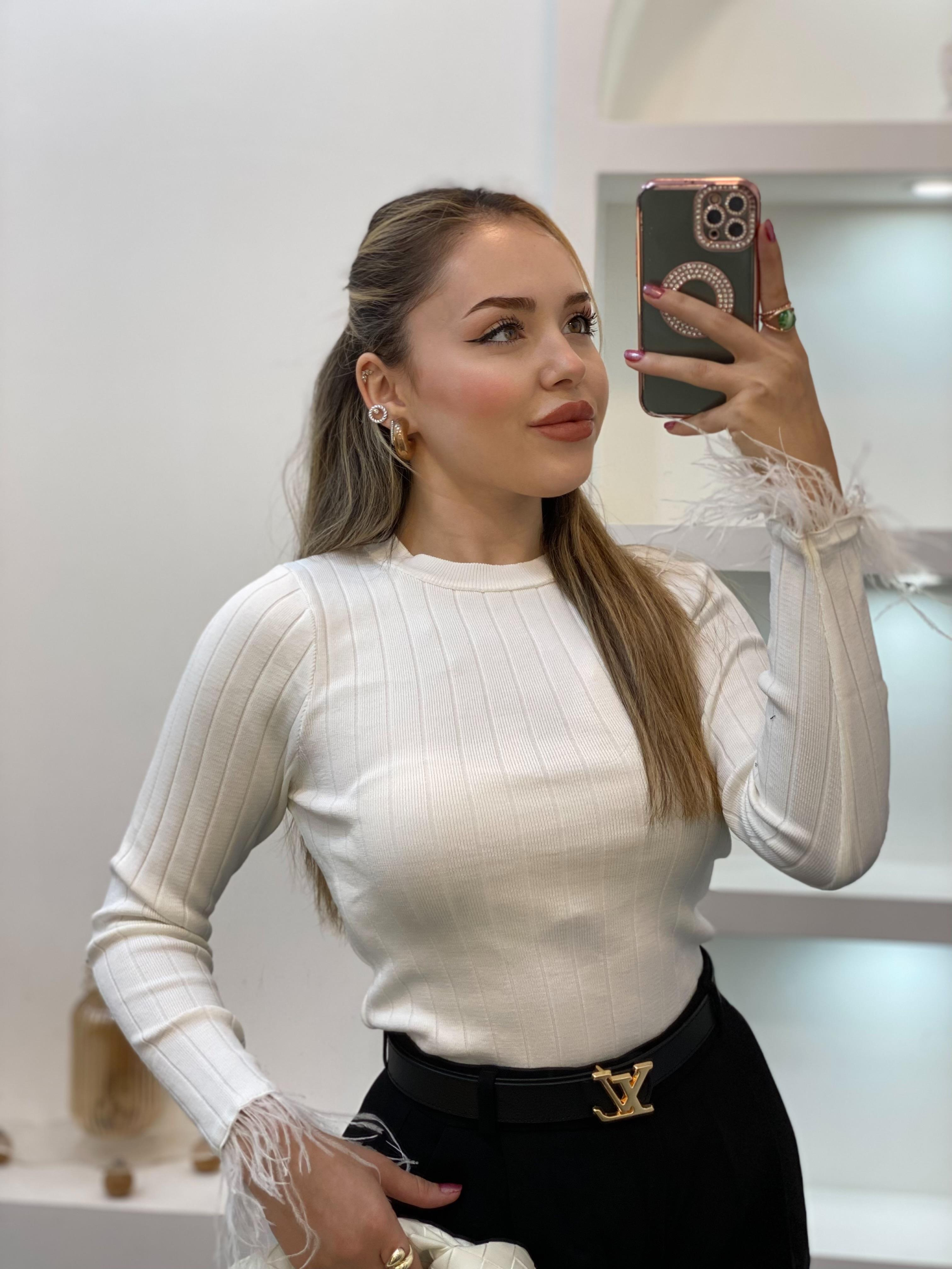 Beyaz Bilekleri Otrişli Model Triko Bluz