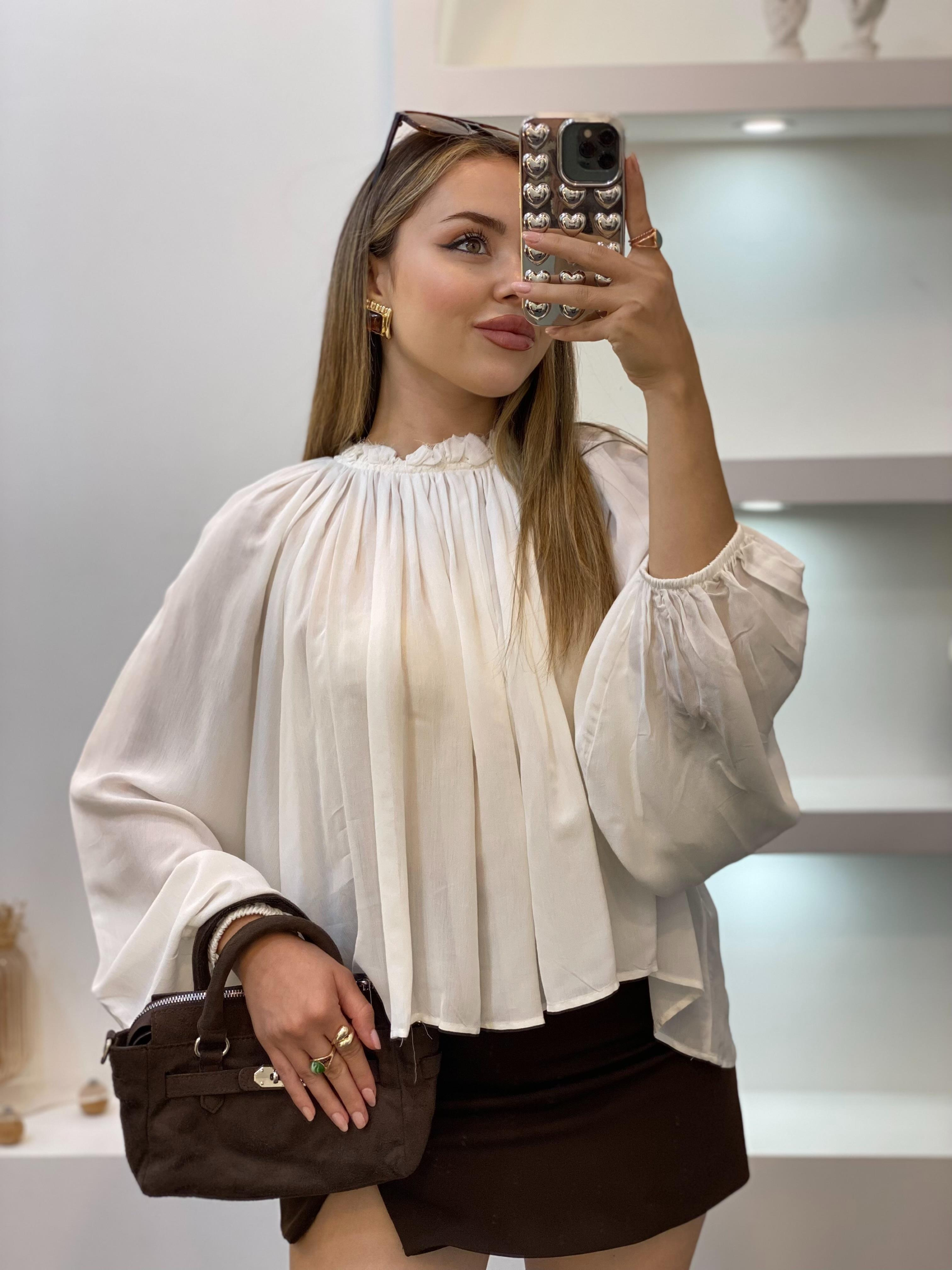 Beyaz Yakası Büzgülü Premium Seri Şifon Bluz
