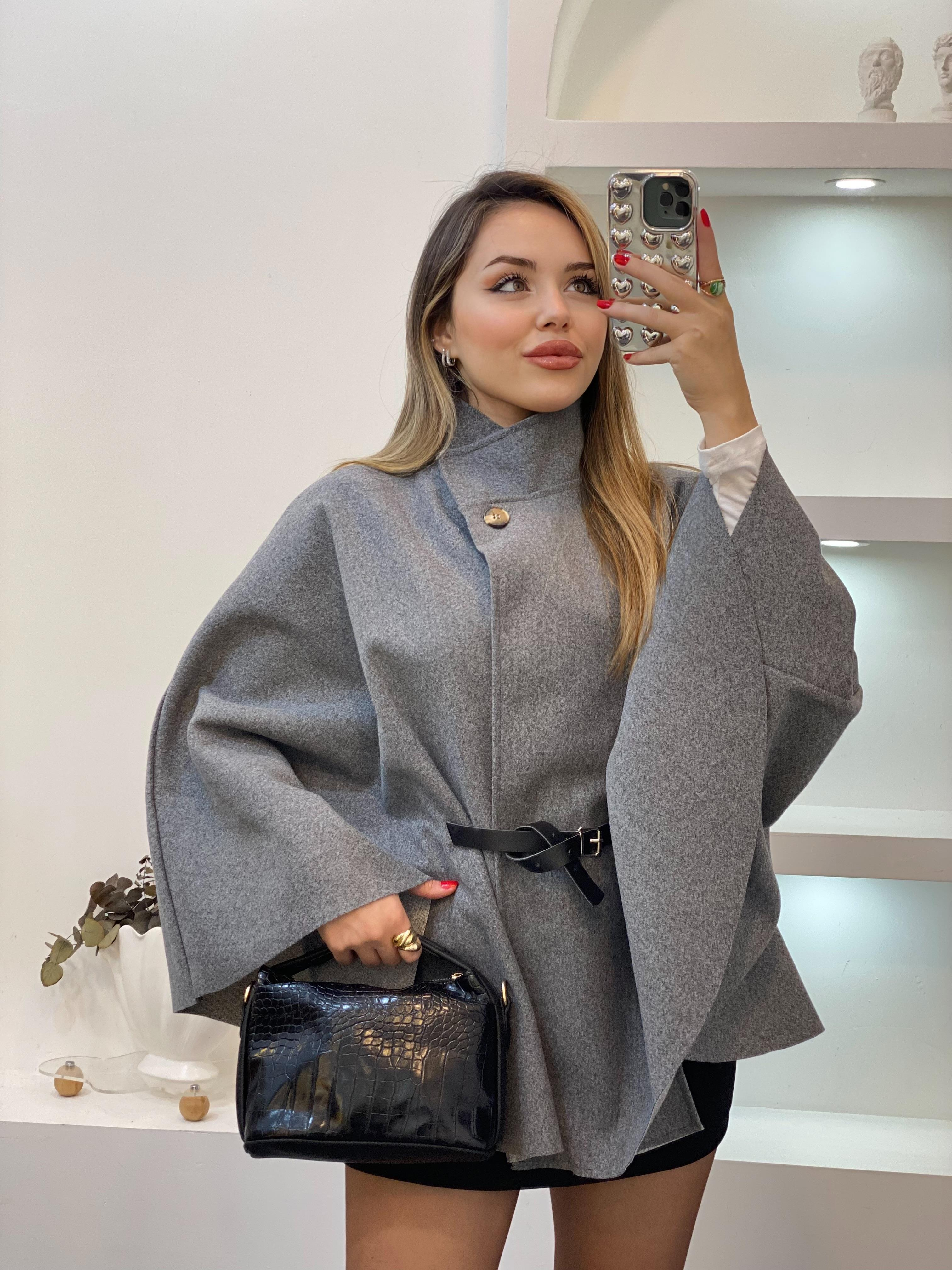 Gri Dik Yaka Kemerli Kaşe Panço