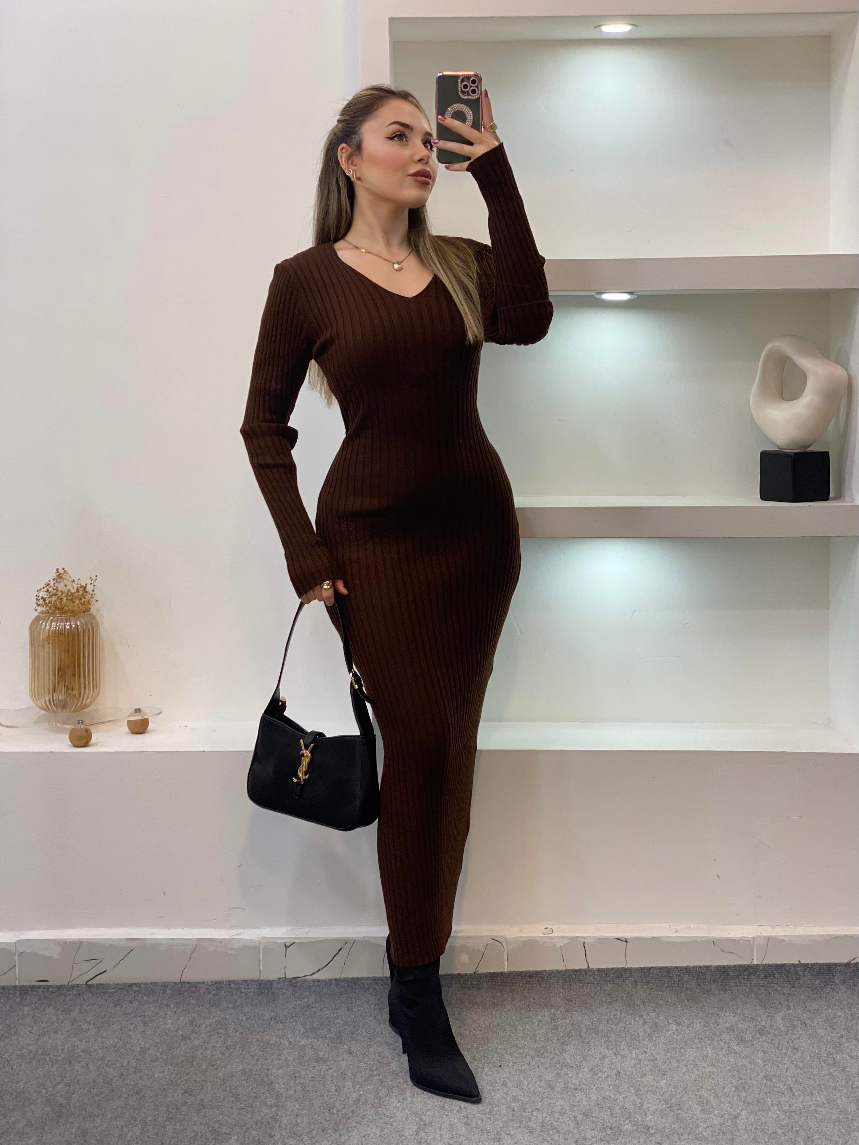 Kahve Arka Beli Kuşaklı Model Triko Elbise