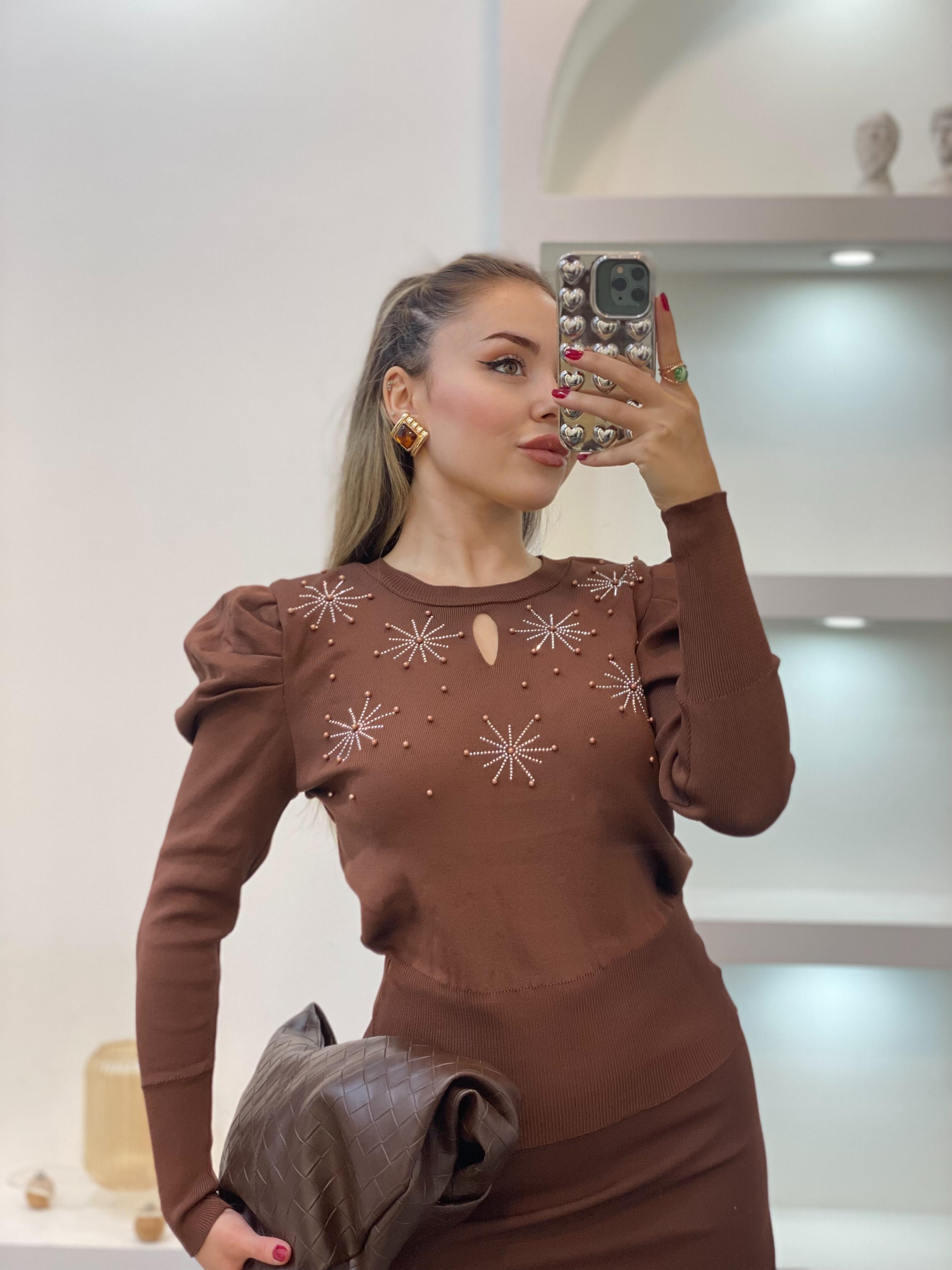 Kahve Önü Mini Pencereli Taşlı Triko Bluz