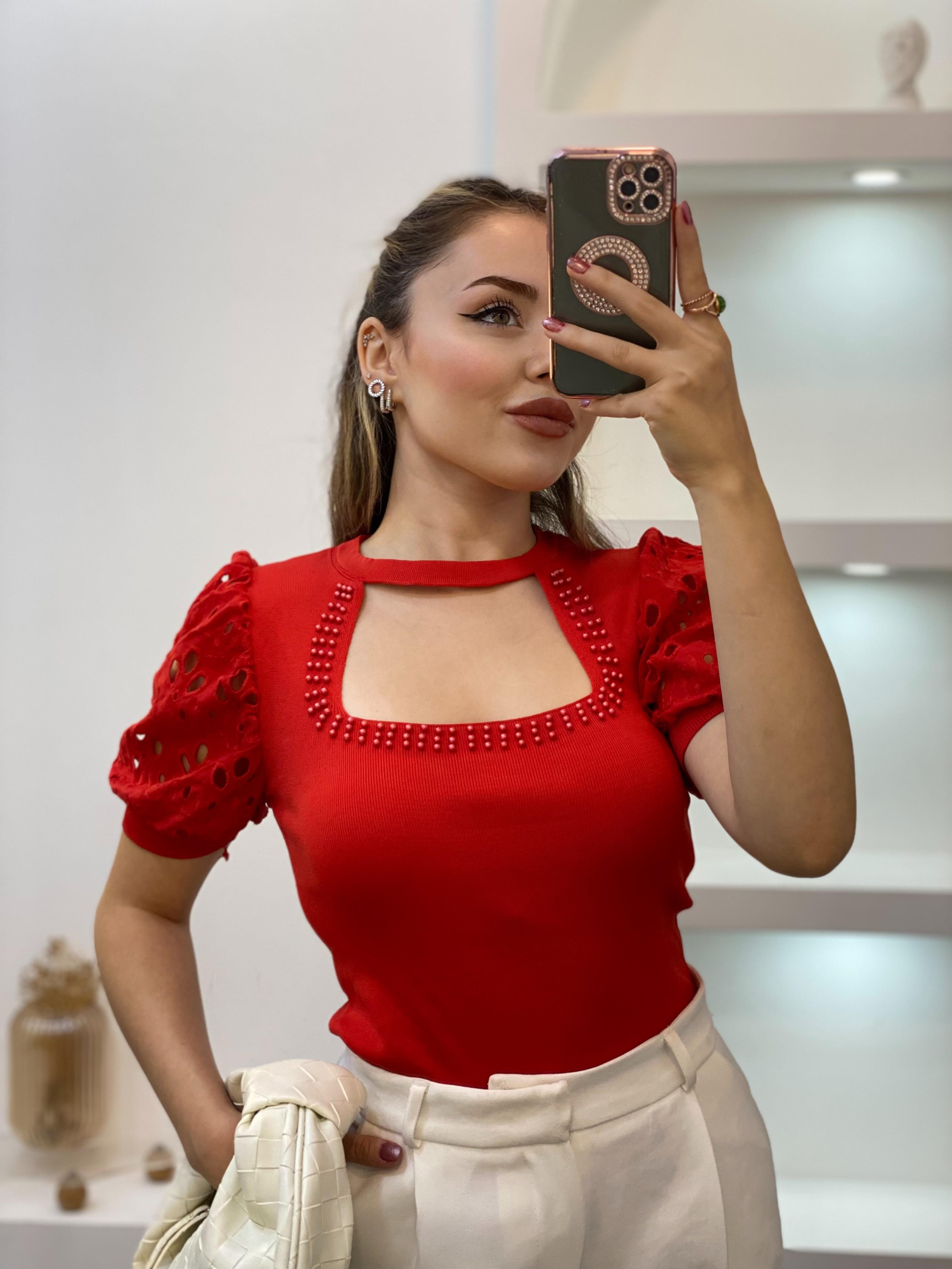 Kırmızı Fisto Kol Önü Pencereli Model Triko