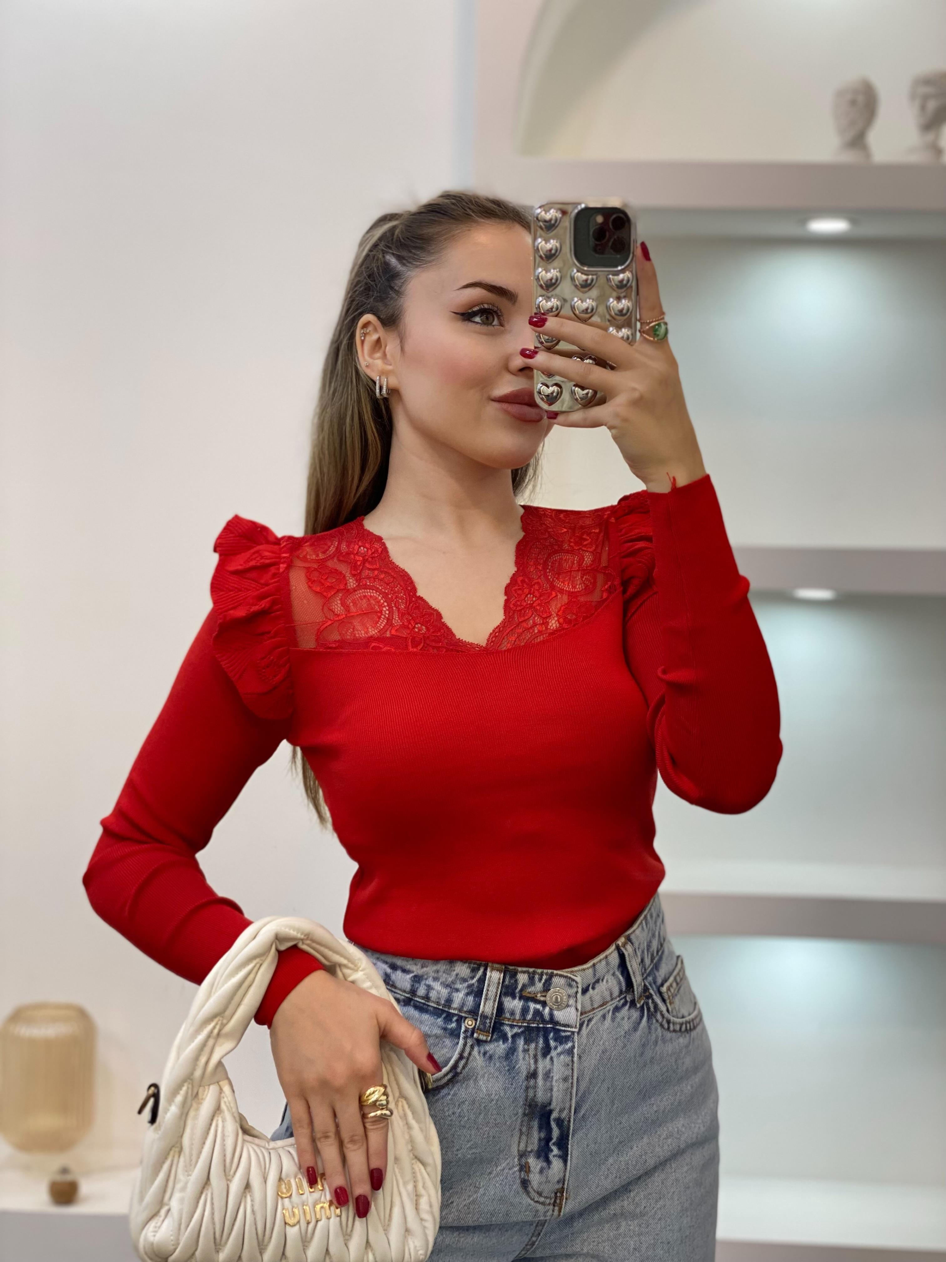 Kırmızı Kolları Volanlı Dantel Detaylı Triko Bluz