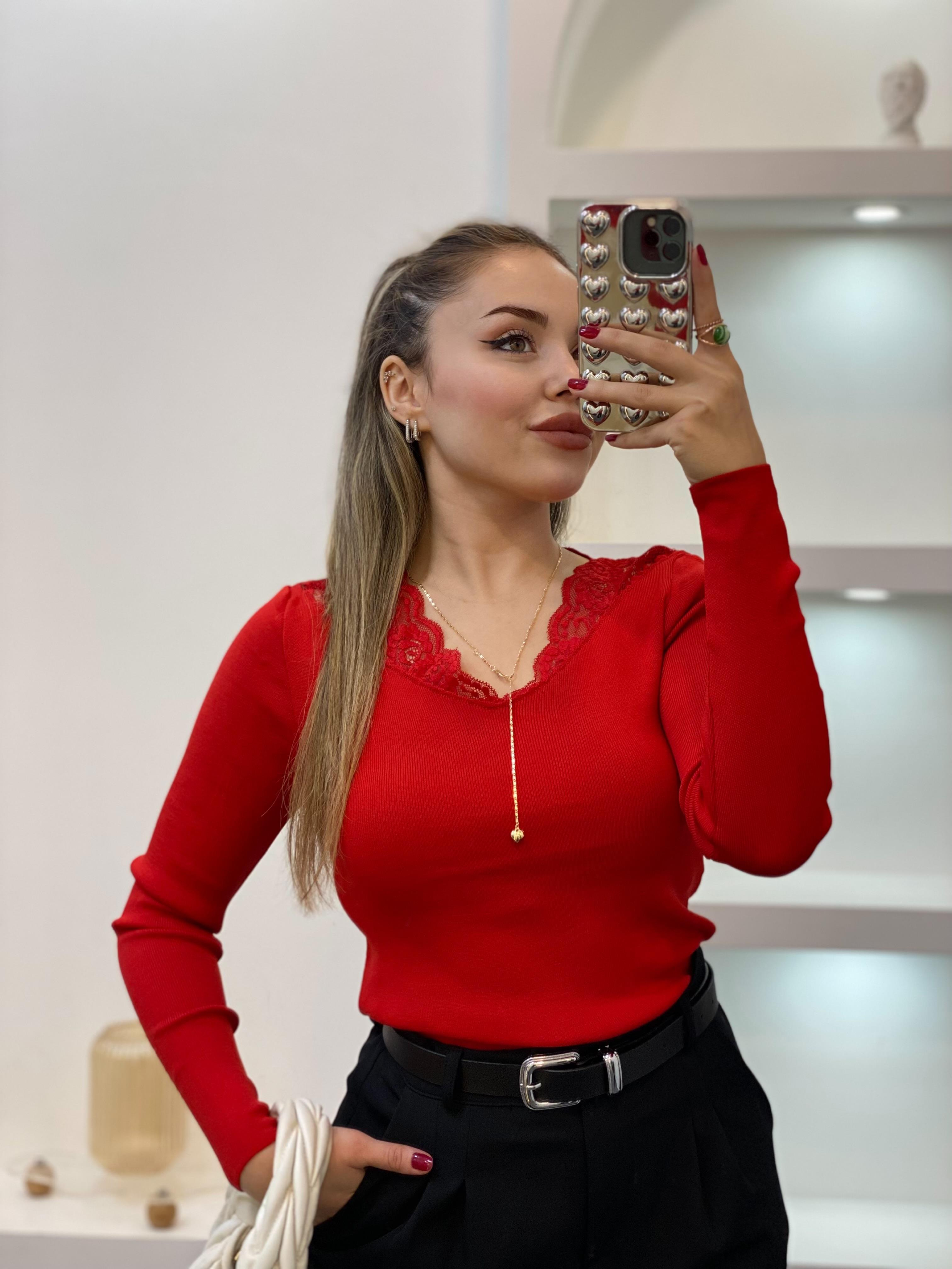 Kırmızı V Yaka Dantel Detaylı Triko Bluz
