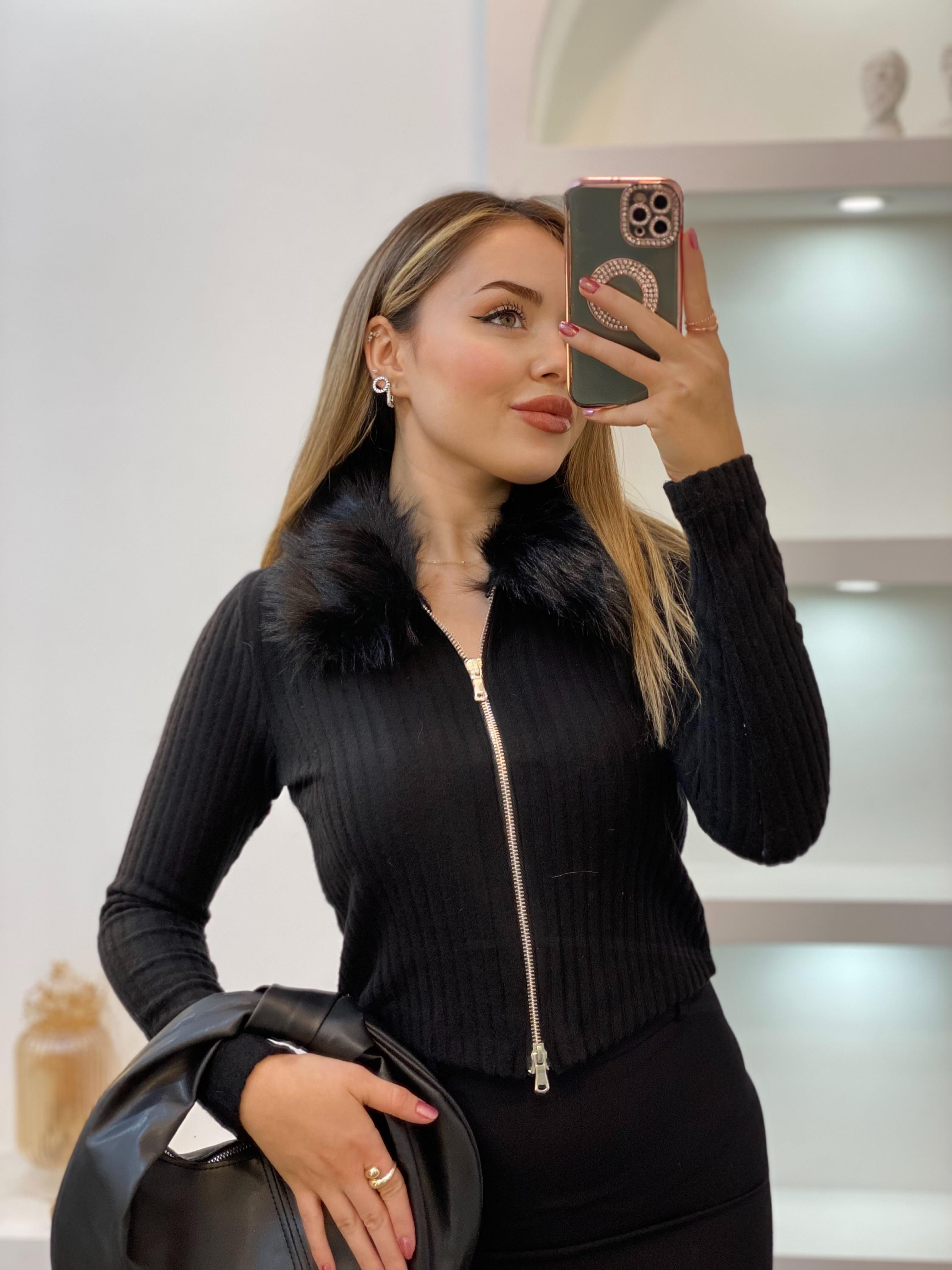 Siyah Fermuarlı Kürk Yakalı Bluz