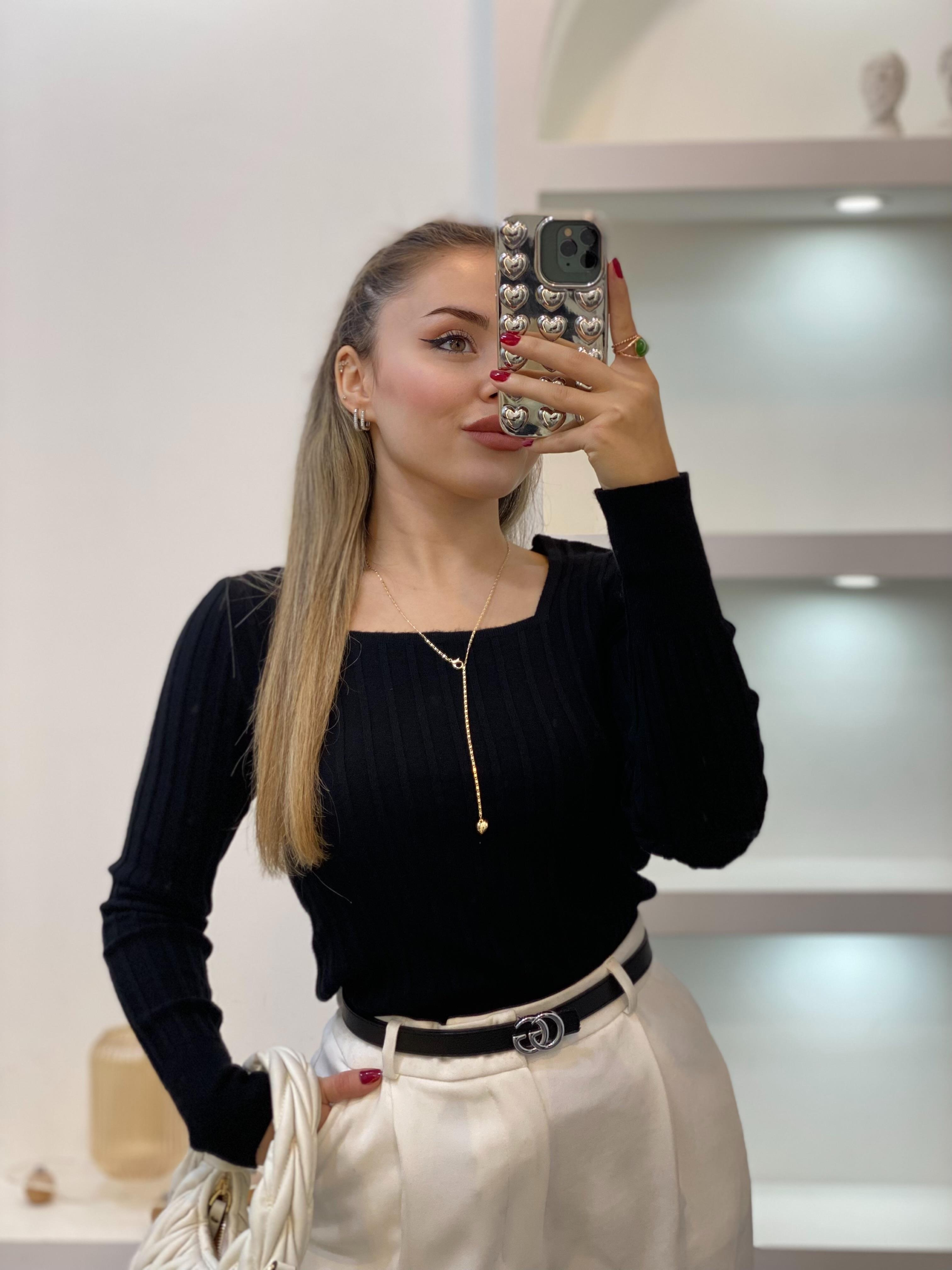 Siyah Kare Yaka Yumoş Dokulu Triko Bluz