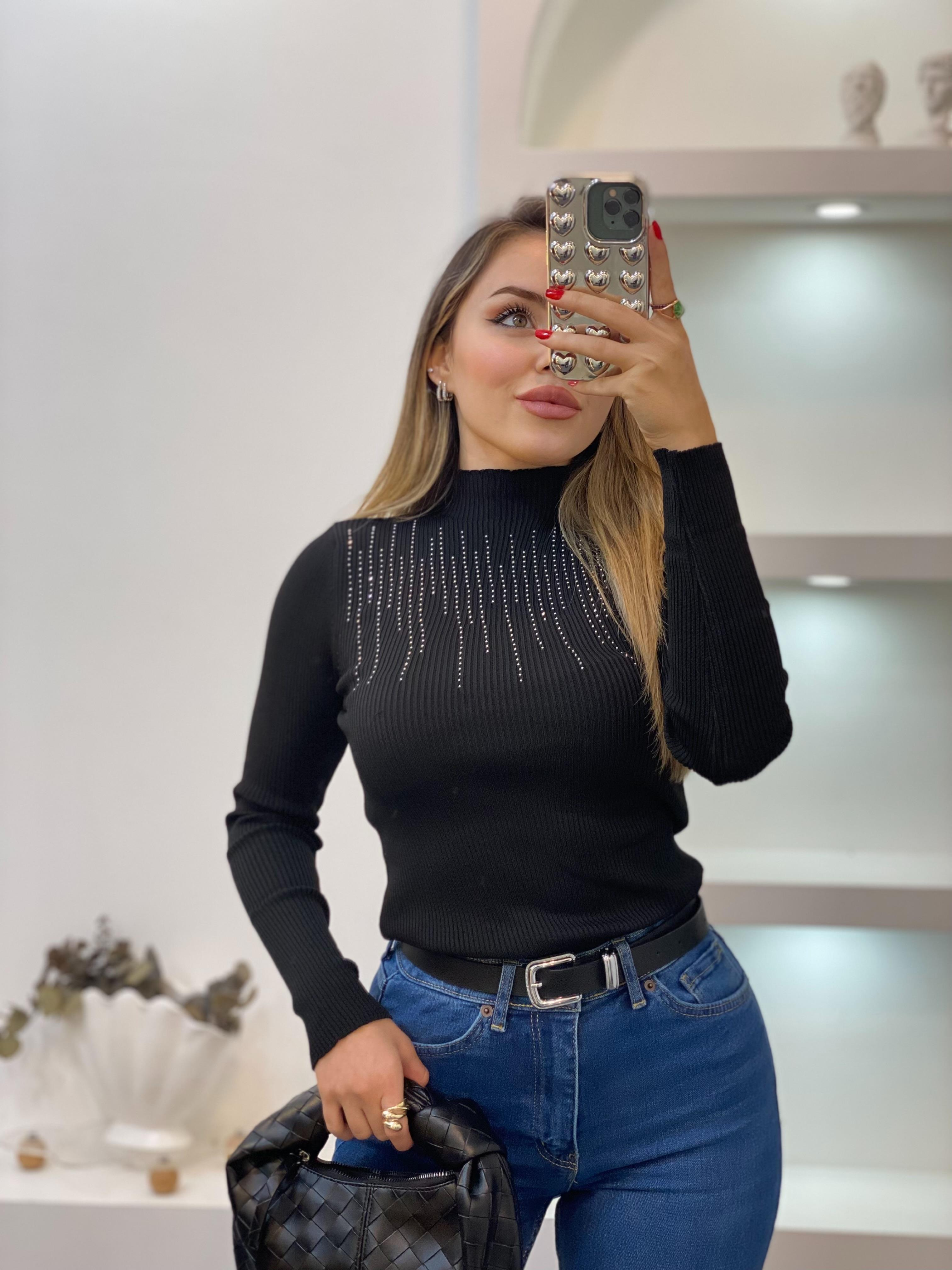 Siyah Parıltılı Taşlı Boğazlı Triko Bluz