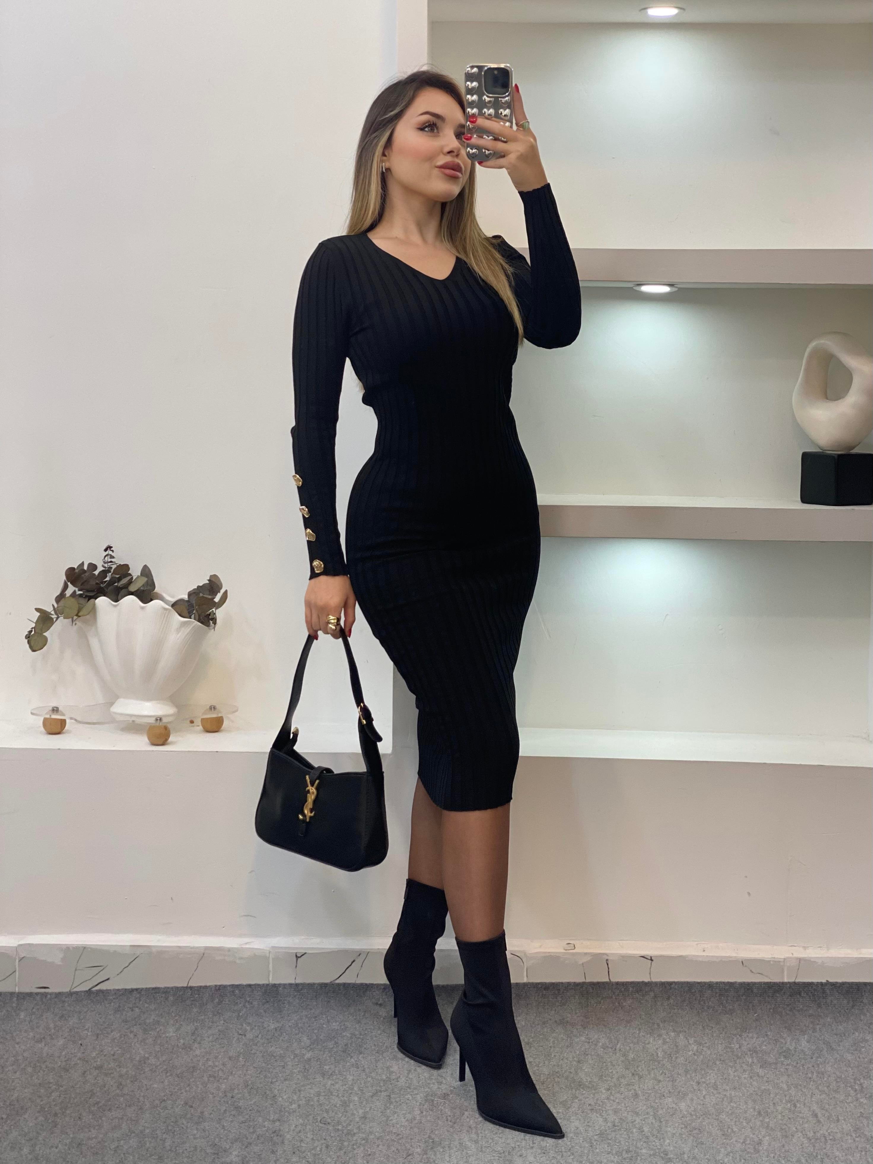 Siyah V Yaka Bilek Gold Düğmeli Triko Elbise