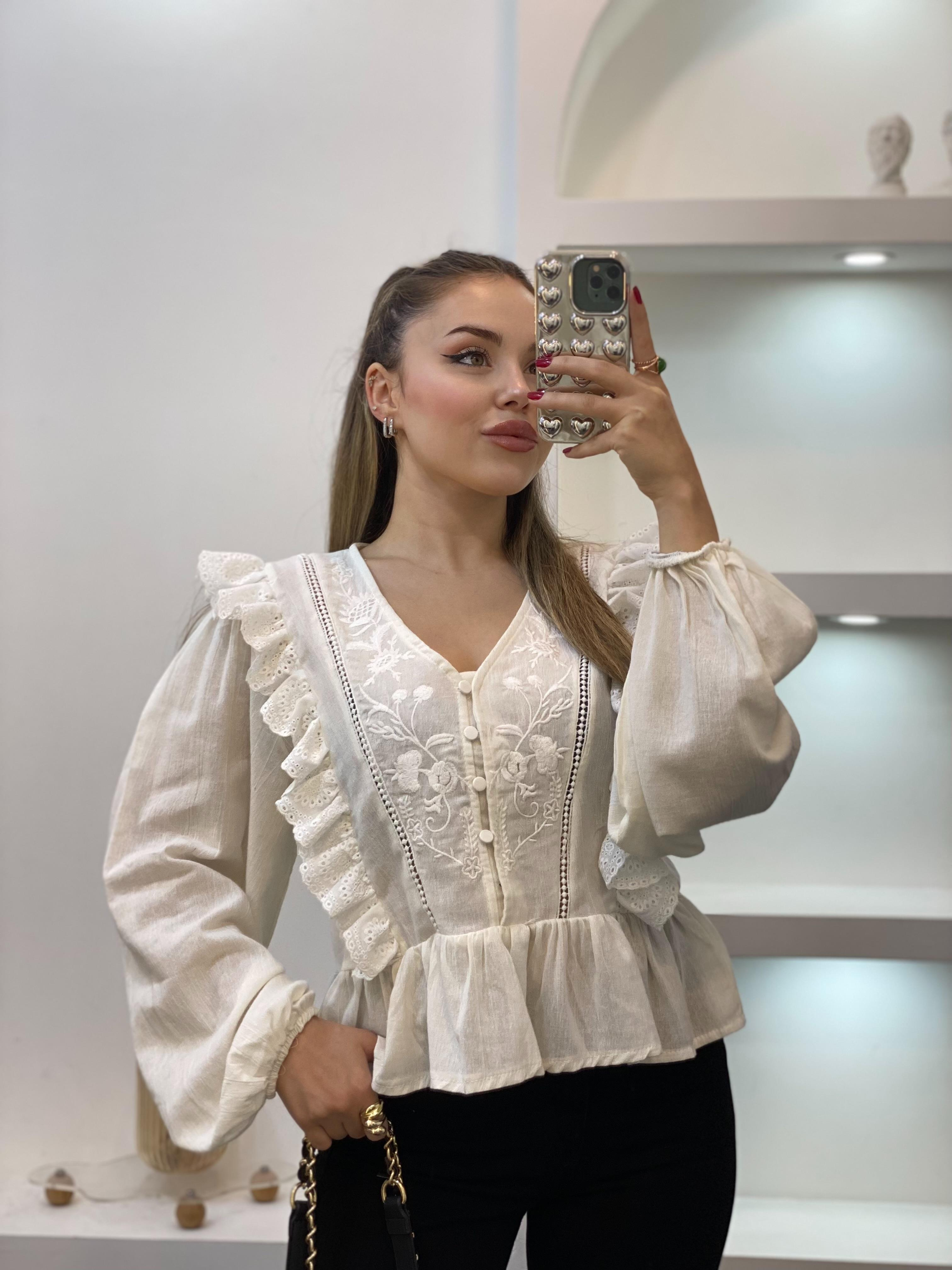 Tasarım Beyaz Fisto Detay Nakışlı Volanlı Bluz