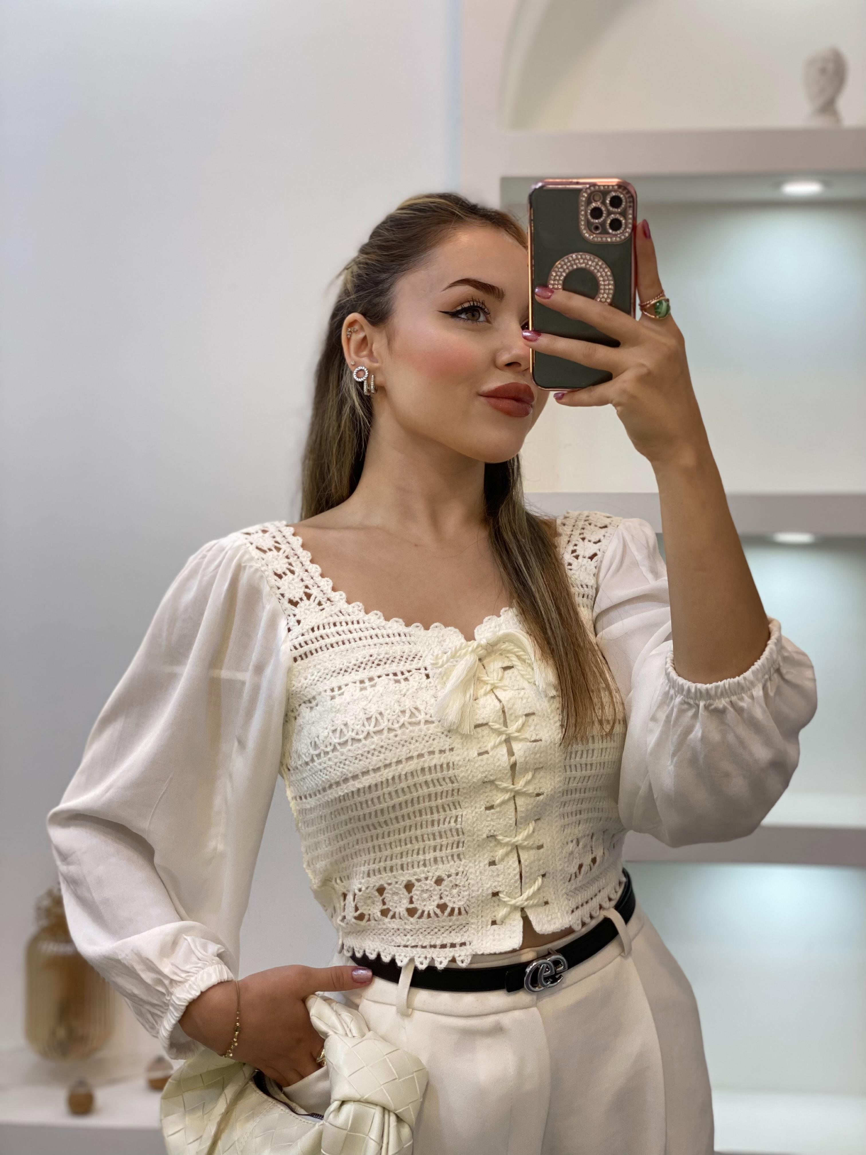 Tasarım Kırık Beyaz Önü Bağlamalı Model Dantel Bluz