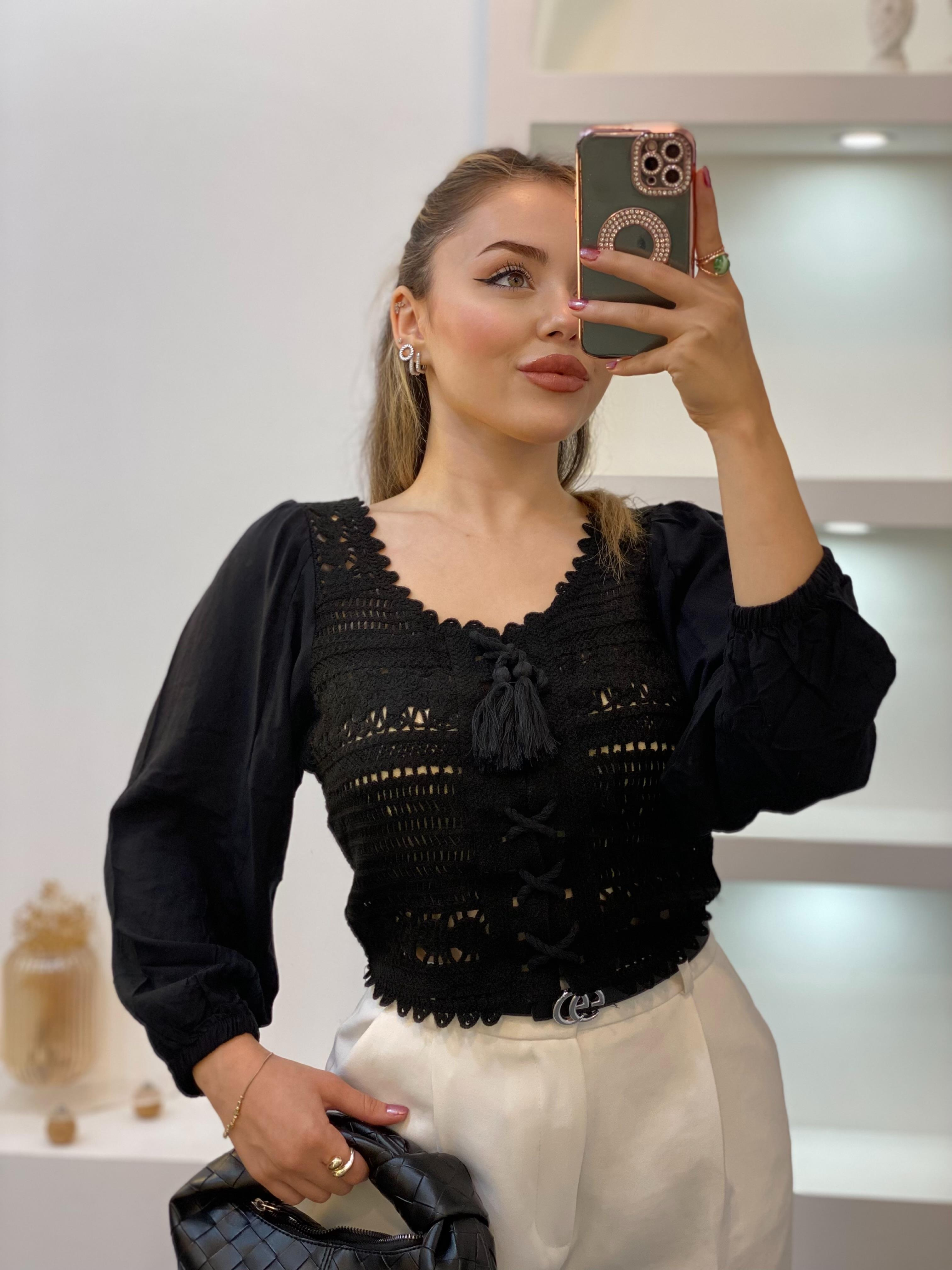 Tasarım Siyah Önü Bağlamalı Model Dantel Bluz