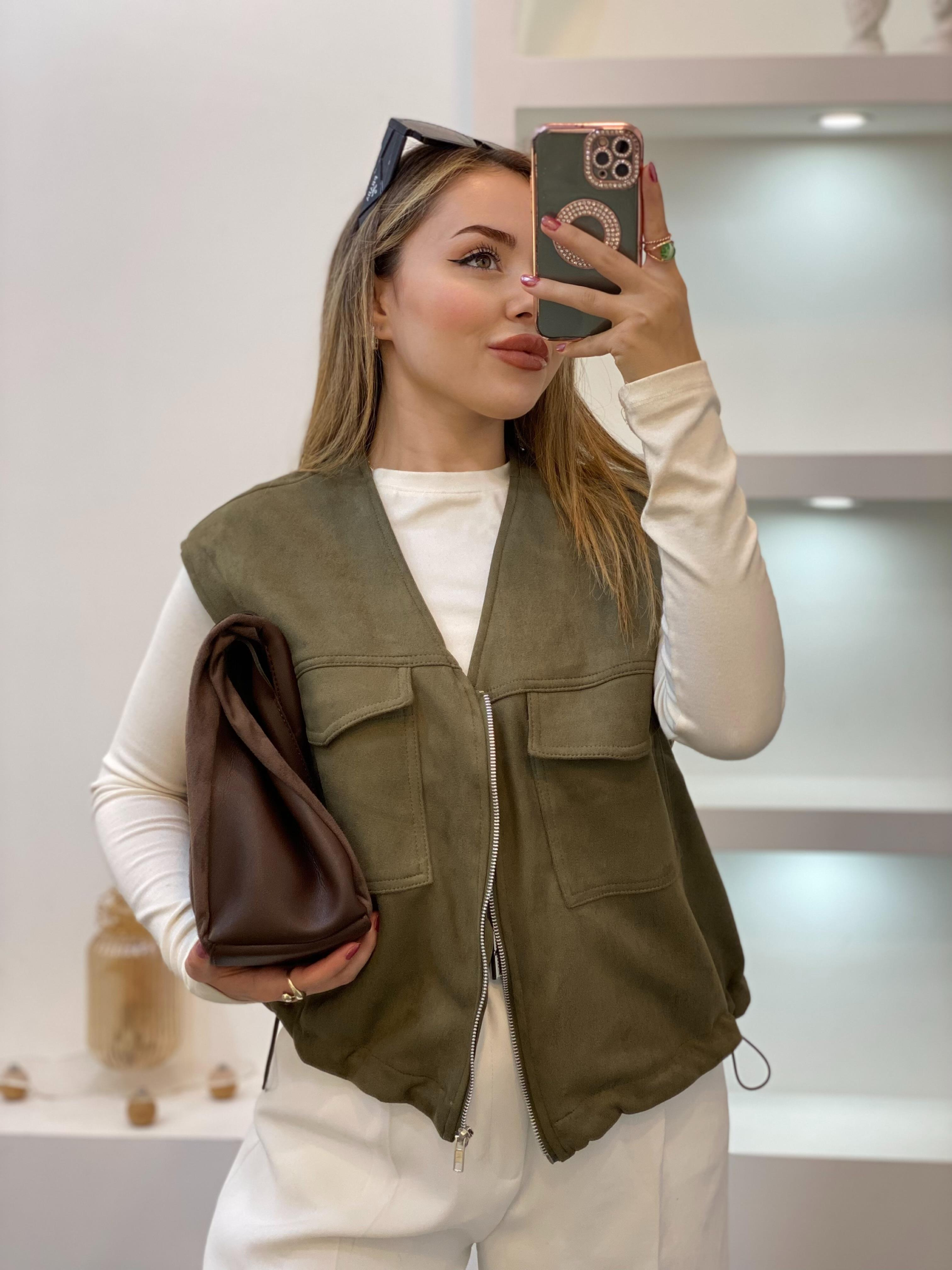 Yeşil Renk Süet Önü Cepli Yelek